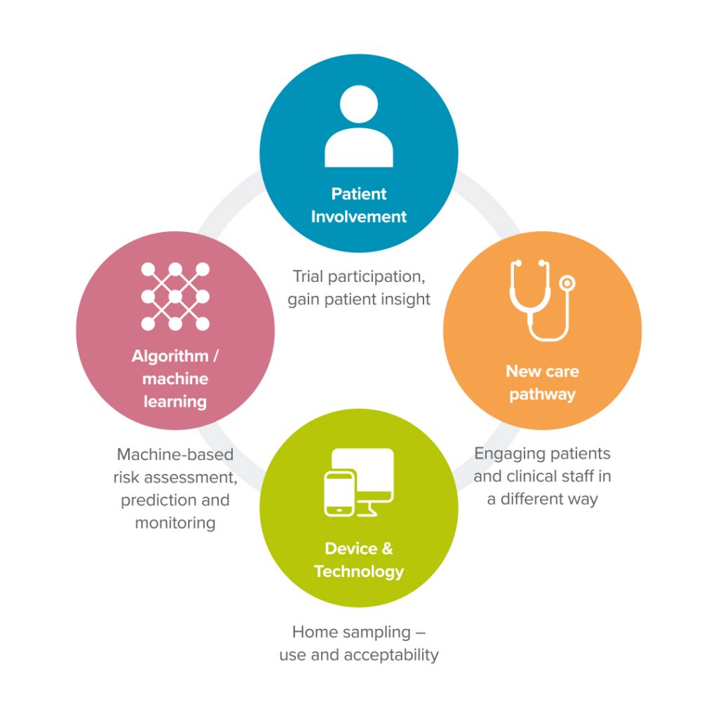 Advances in digital health and technology mean that we can conduct research into using technology and digital solutions for use in clinical trials to gather, interpret or analyse data. Our main research focus is designing and developing technology clinical trials. Depending on the clinical need this can involve several different areas of research – patient involvement, AI using machine learning, devices in the home and the development of new care pathways and digital biomarkers.